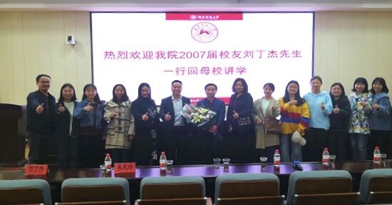鲁良对刘丁杰的到来表示热烈的欢迎。他向大家详细介绍了刘丁杰及其为学院做出的贡献。他表示,刘丁杰学习时期生活艰难,创业时期道路坎坷,但是他的努力坚持造就了今日的成功。刘丁杰反哺母校,曾先后在我校捐助200万元设立"宏博文明使者”道德风尚奖、“宏博·国旗卫士奖”、“宏博·家基金”。