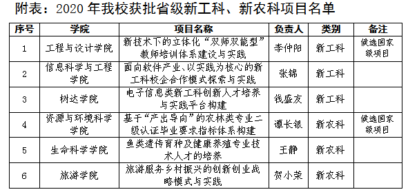近日,教育厅公布了2020年湖南省新农科(湘教通﹝2020﹞94号)研究与实践项目立项结果。我校新农科获得省级立项3项,其中由我院旅管系牵头申报的“旅游服务乡村振兴的创新创业战略模式与实践”获得省级立项。