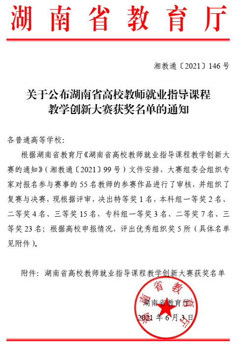 本次比赛由湖南省教育厅主办,湖南省教育厅毕业生就业办公室和湖南省大中专学校学生信息咨询与就业指导中心承办,该比赛是全国高校教师教学创新大赛的就业指导课程教学赛道。通过本次比赛,进一步体现了我院“以学生为中心”的教育理念和重视课堂教学、重视学生就业工作作风。对于不断提升就业指导课程建设实效,促进毕业生更加充分更高质量就业创业具有重要意义。