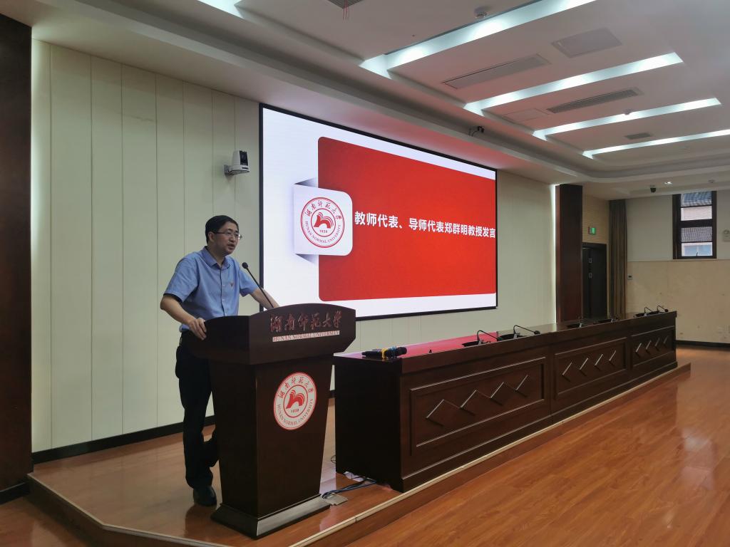 教师代表、导师代表郑群明教授用四个“心”寄语全体毕业生:常怀感恩之心、保持好学之心、常抱乐观之心、坚持创造之心;