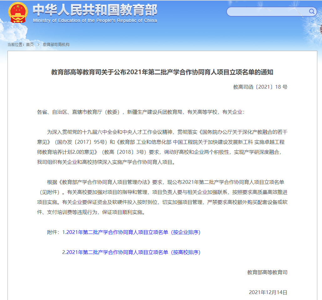 为贯彻落实《国务院办公厅关于深化高等学校创新创业教育改革的实施意见》(国办发〔2015〕36号)和《国务院办公厅关于深化产教融合的若干意见》(国办发〔2017〕95号)精神,深化产教融合、校企合作,教育部高等教育司组织了有关企业支持高校共同开展产学合作协同育人项目。
