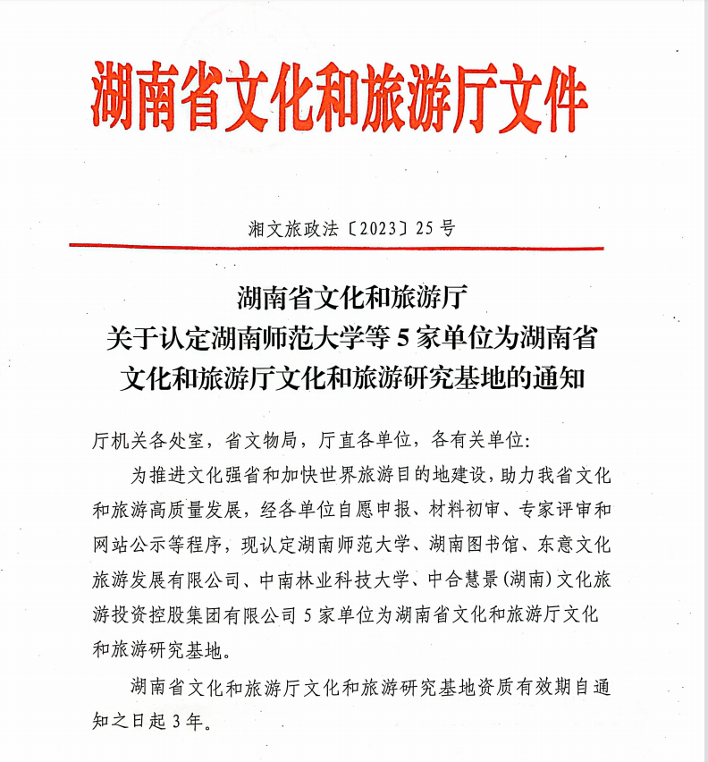 近日,湖南省文化和旅游厅公布了认定文化和旅游研究基地的结果,我校获批认定为湖南省文化和旅游厅文化和旅游研究基地。