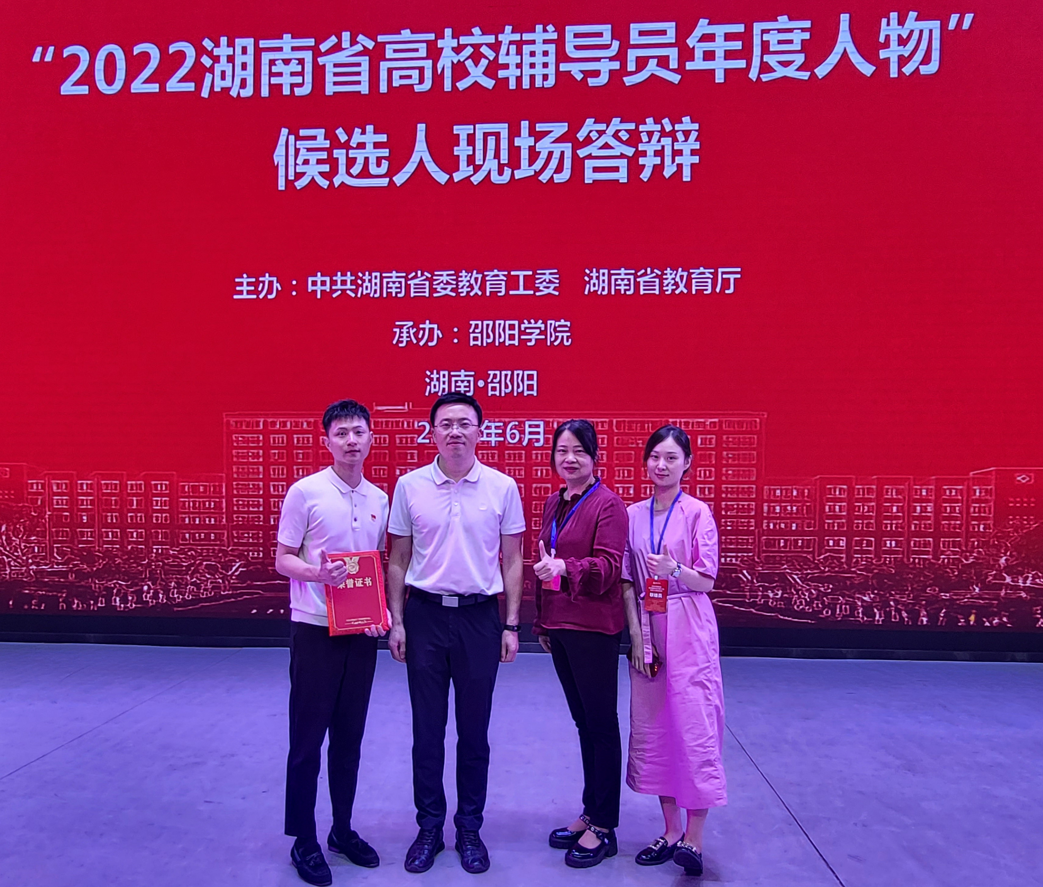 6月14日下午,由湖南省委教育工委、省教育厅举办的“2022湖南省高校辅导员年度人物”推选展示活动结果揭晓,我院辅导员龚曦荣获“2022湖南省高校辅导员年度人物”。