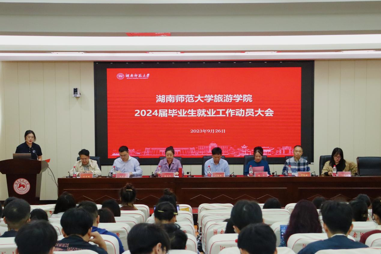 为引导2024届毕业生准确把握就业形势,明确就业发展方向,9月26日上午,我院于中和讲堂召开2024届本科毕业生就业工作动员大会,学院院长王兆峰,学院党委副书记廖欢,学院党委专职组织员骆劲华,校友代表、金茂华中大区综合人力中心总经理邓雄亮出席,会议由2020级辅导员邱粤湘主持。