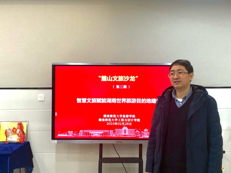 2月28日上午,我院在中和楼一楼工会活动室举行了第三期“麓山文旅沙龙”。本次沙龙主题为“智慧文旅赋能湖南世界旅游目的地建设”,沙龙活动由我院副院长、旅游管理系党支部书记郑群明主持。沙龙邀请了工程与设计学院教授陈剑和副教授王巍作为嘉宾出席沙龙,我院党委副处级专职组织员骆劲华,会展经济与管理系主任孟奕爽以及学院部分研究生和本科生参加了沙龙。