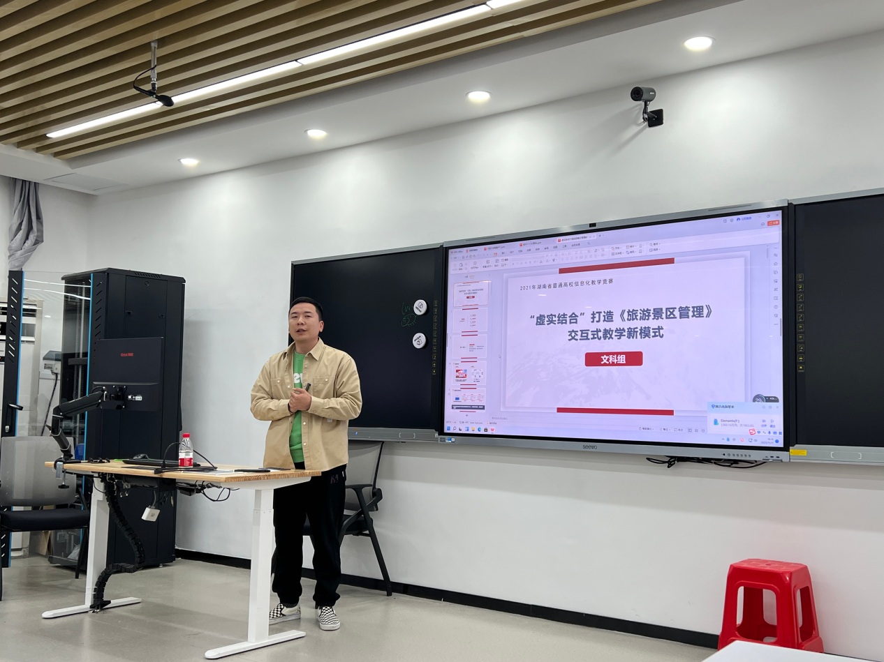 王钊以“虚实结合打造《旅游景区管理》交互式教学新模式”为题进行分享,重点分享了省级信息化教学竞赛的经验,并对本门课程信息化教学设计进行了展示。他表示在教学中要充分分析学生心理,在教学中使用新技术,以“信息化”的新模式激发学生好奇心,增强课程趣味性。