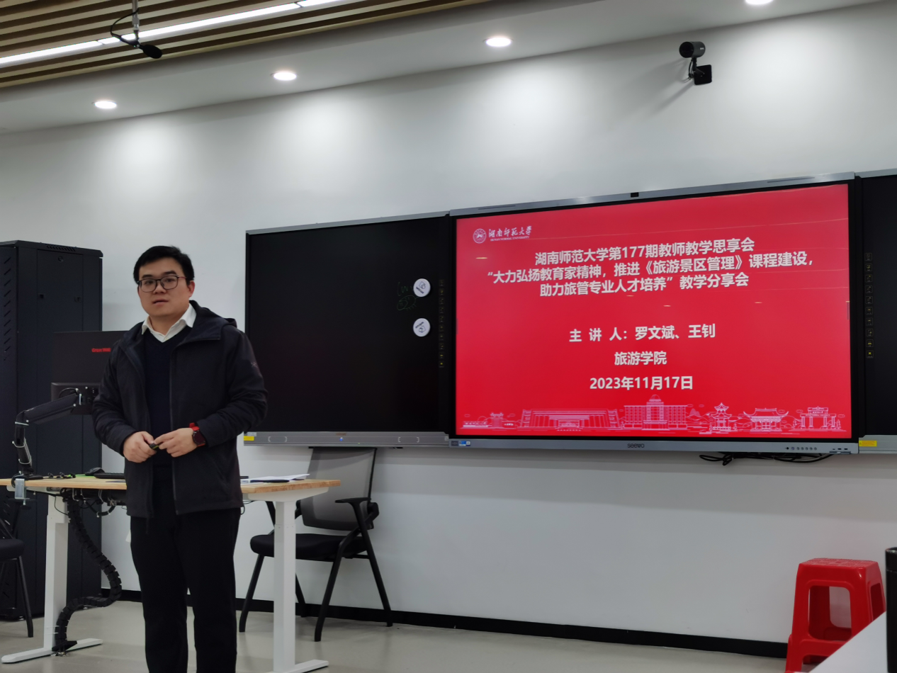 在教学成果分享环节,罗文斌以“《旅游景区管理》课程建设与人才培养”为主题进行了分享。他首先分享了近期学习领会习近平总书记关于弘扬教育家精神的重要指示的心得体会,表示要以教育家精神为指引,上好每一节课来践行教育家精神。其次,介绍了《旅游景区管理》课程建设的总体情况,提出了“把课堂还给每一个学生”的建构主义研究性教学模式,从课程教学理念创新及信息技术手段融入、思政要素融入、实践教学融和科学成果融入等方面分享了《旅游景区管理》课程教学体系重构以及建设进展,并重点介绍了学习通、雨课堂、智慧树等信息教学技术和平台在课堂中的应用情况。最后,分享了教学创新设计、课程思政教学设计两个案例以及课程建设成效。
