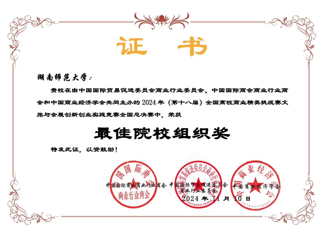 由中国国际贸易促进委员会商业行业委员会、中国国际商会商业行业商会和中国商业经济学会联合主办的第十八届全国高校商业精英挑战赛文旅与会展创新创业实践竞赛全国总决赛于2024年11月9日圆满成功举办。经过激烈角逐,我院学子共荣获一等奖3项,二等奖1项,三等奖2项,多位老师获得“最佳指导教师奖”,学校获得“最佳院校组织奖”。