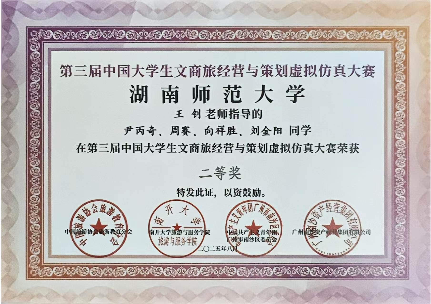 8月19日至24日,第三届中国大学生文商旅经营与策划虚拟仿真大赛总决赛在广州南沙举办,我院旅游管理系副教授王钊老师指导的尹丙奇、向祥胜、刘金阳、周赛本科生团队斩获全国二等奖,王钊老师获评“优秀指导教师”,系我院学子继第二届大赛后再度获此全国性赛事佳绩,彰显专业育人实力。