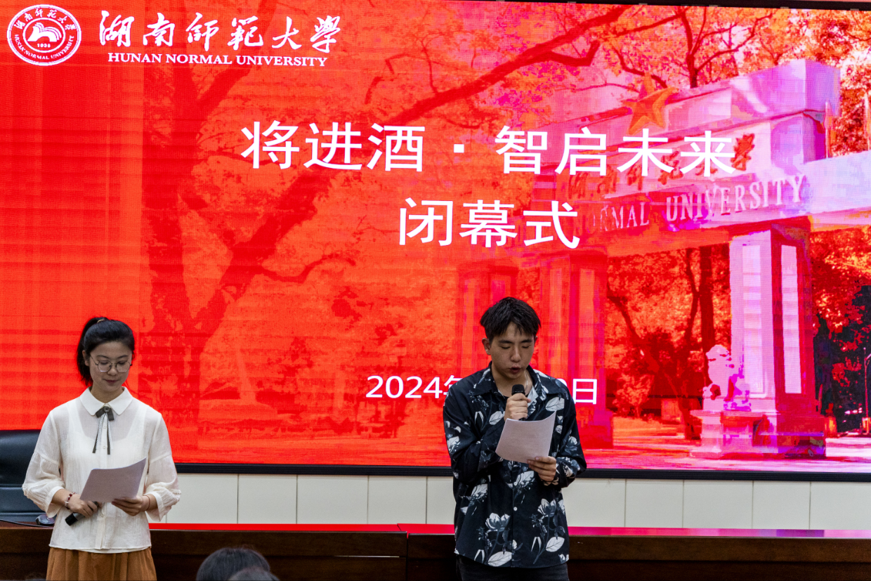 闭幕式采用轻松有趣的形式展开。活动的开始由将进酒工作组集体演出,将进酒工作组总队长李洋对将进酒活动进行工作总结。随后由2022级酒店管理刘世豪同学为大家带来歌曲表演。其后是“将进酒”活动的成果展示,包括活动心得分享和优秀组视频展示。