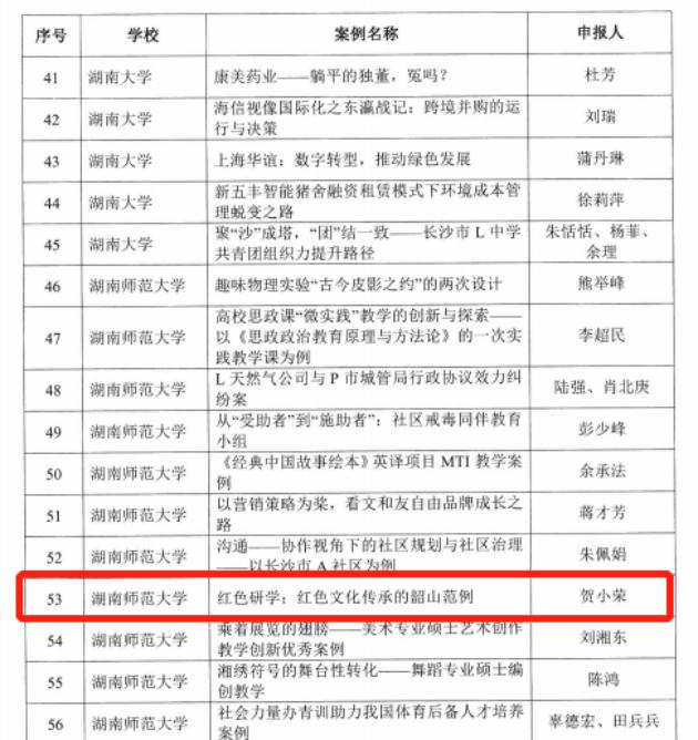 贺小荣教授申报的《红色研学:红色文化传承的韶山范例》获评湖南省专业学位研究生优秀教学案例,专业学位研究生的培养过程中更需强调理论在实际中的应用,而优秀教学案例的建设无疑为我院专业学位研究生的课程教学与提升提供了一大助力。