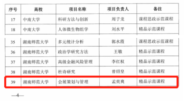 孟奕爽副教授的《会展策划与管理》课程获评湖南省研究生精品示范课程。课程建设与改革是人才培养的核心环节,省级精品师范课程的建设进一步完善了我院优质课程体系,必将为打造更多高级别一流课程和提升研究生教育质量提供坚实的保障基础。