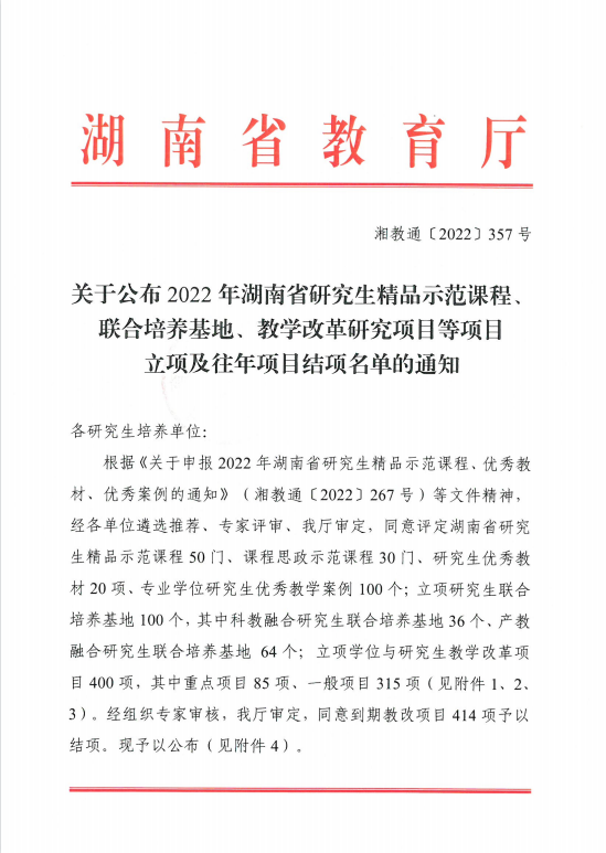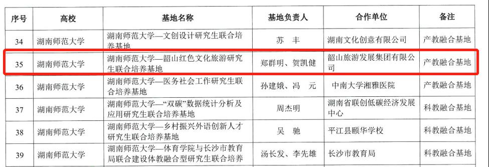 12月30日,湖南省教育厅发布《关于公布2022年湖南省研究生精品示范课程、联合培养基地、教学改革研究项目等项目立项及往年项目结项名单的通知》,由我院研究生主管副院长郑群明教授和MTA学位点负责人贺凯健教授负责,与韶山旅游发展集团有限公司联合申报的“伟德BV1946-韶山红色文化旅游研究生联合培养基地”获批省级研究生产教融合基地。该基地由我院与韶山旅游发展集团有限公司共同建设,是我院获批的第三个省级研究生产教融合基地,将充分利用学校和基地的资源优势,促进产教融合,通过教学科研助推产业发展和人才培养,通过产业项目反哺教学科研,推动产学研一体化,实现资源、人才、知识互通。
