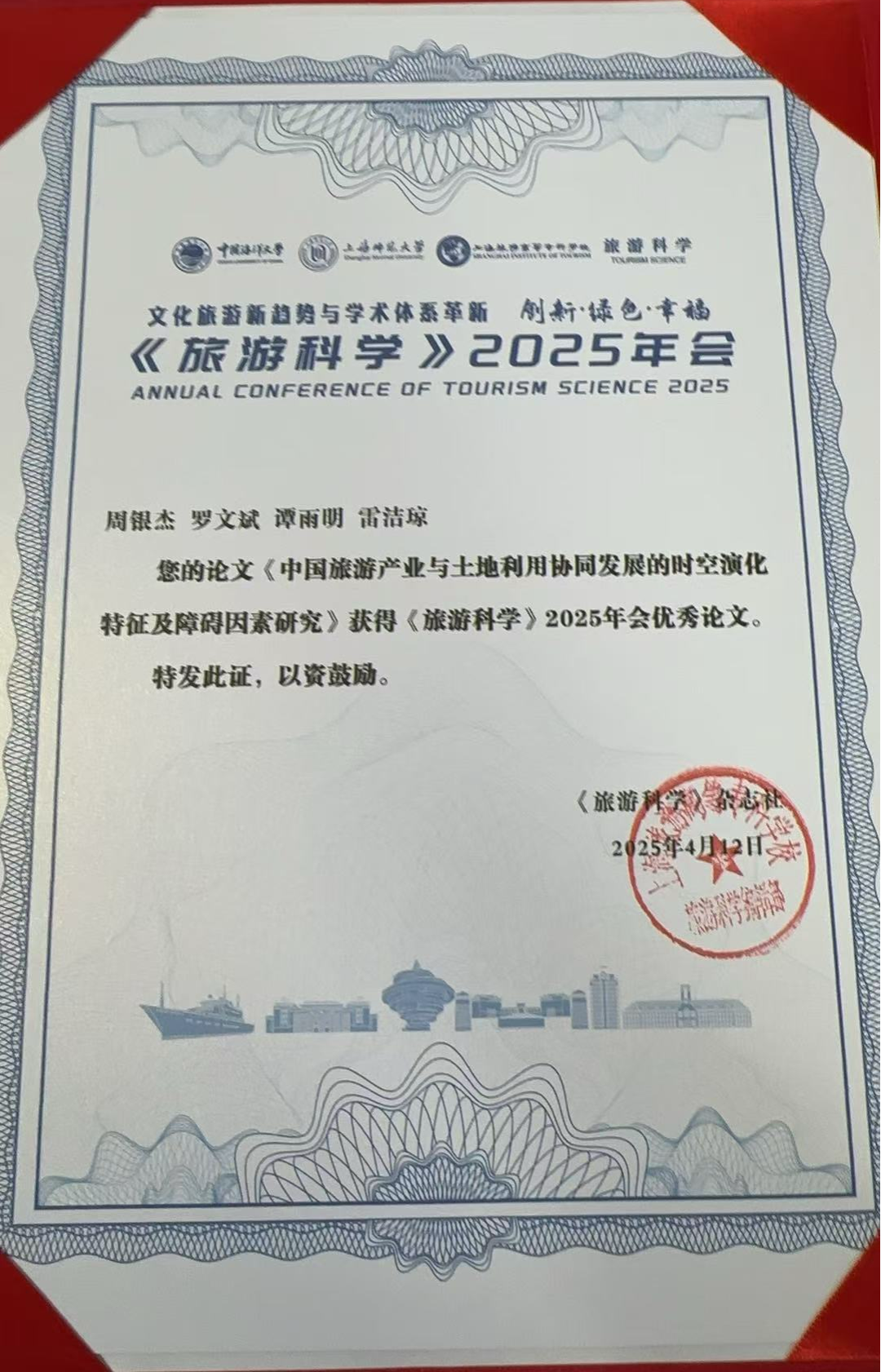 4月10日-13日,《旅游科学》2025年会在中国海洋大学崂山校区顺利召开,本次会议以“文化旅游新趋势与学术体系革新”为主题,共设立31个平行论坛,经分论坛推荐和会议专家组评审,最终评选出37篇《旅游科学》2025年会优秀会议论文。我院旅游管理系主任罗文斌教授团队提交的研究成果“中国旅游产业与土地利用协同发展的时空演化特征及障碍因素”,入选《旅游科学》2025年会优秀论文奖。