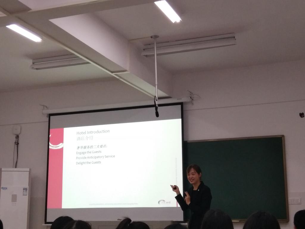 Sunny从个人发展、酒店介绍、万豪介绍、酒店行业发展四个方面跟同学们分享了她的经验。她强调,作为一个酒店人,要真诚谦恭、诚实热情。不要拘泥于当下,要培养长远眼光,不断学习,不断进步。此次讲座,她特别指出好的服务的重要性,酒店人要始终以一颗真诚的心去服务我们的客人。