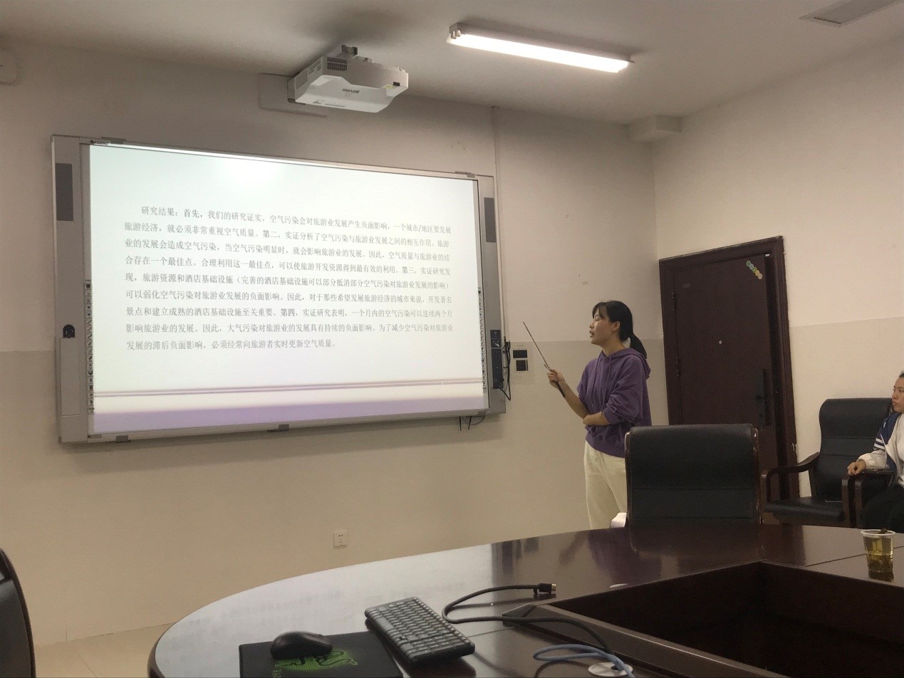 本次会议由胡兵、石松和朱张祥三位老师的研究团队进行了学术汇报。其中,18级旅游地理专业研究生张晓倩汇报了自己关于在线旅游研究的阶段性成果,在场老师就论文的进一步改进提出了建议。18级旅游地理专业研究生沈玲结合自己的研究方向分享了国际旅游学科顶级期刊《Annals of Tourism Research》2020年发表的《Eco-hypocrisy and inauthenticity: Criticisms and confessions of the eco-conscious tourist/traveller》一文,并分享了自己在研究内容和研究方法方面的学习收获。19级旅游地理专业研究生唐佩做了国际顶级期刊跟进,对《Annals of Tourism Research》最新出版的11篇文献进行了介绍。在三位同学的汇报过程中,各位老师发表了评论,并讨论了科研过程中需要注意的一些问题,提出相关建议。