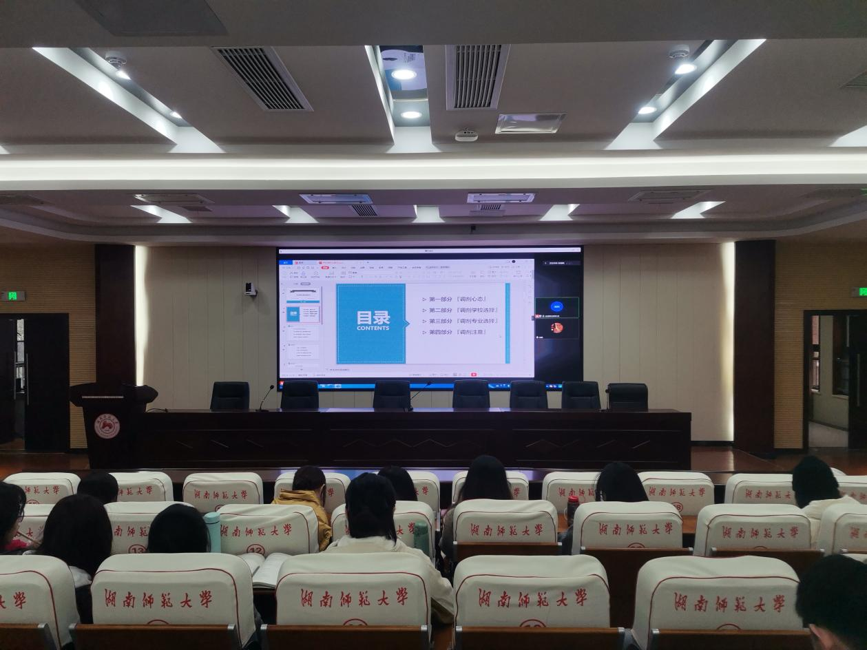 优秀校友代表段湘辉围绕调剂心态、调剂学校选择、调剂专业选择、调剂注意事项四个方面分享调剂了经验,并提醒大家调整心态、珍惜机会、不断学习。