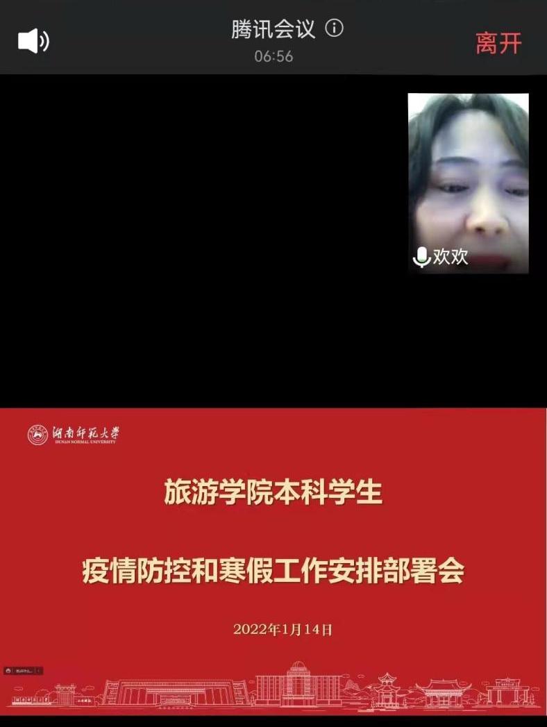 会上,副书记廖欢传达了近期学校防疫工作要求,叮嘱学生干部们要继续发挥先锋模范作用,引导班级同学认真落实“畅通沟通渠道,及时报送个人动向,加强个人防护、按期接种疫苗”等防控系列措施,筑牢假期安全网。同时,廖书记温馨寄语同学们寒假期间注意劳逸结合,既抓好学业,又保持充分锻炼、与家人共度祥和、安康春节!
