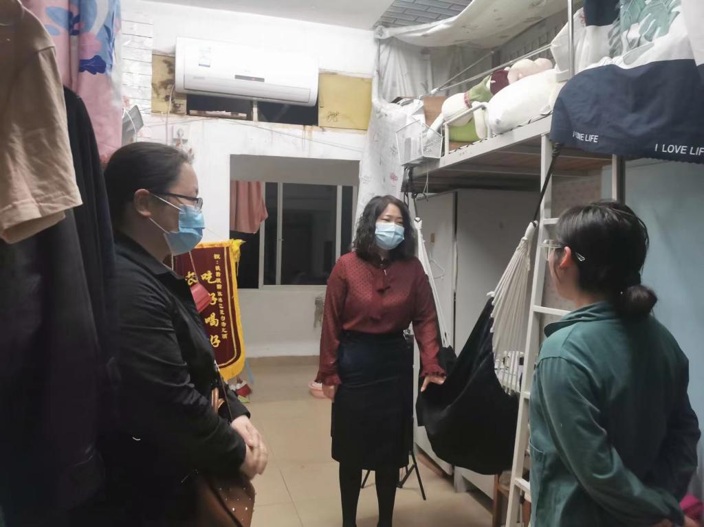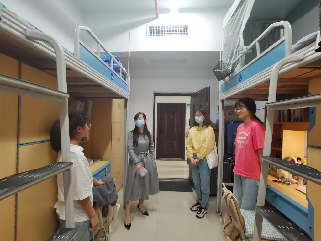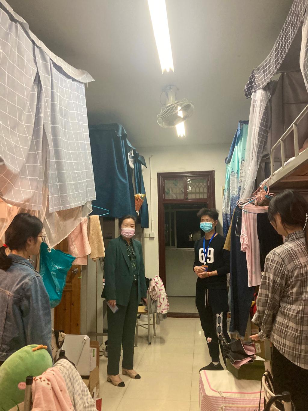 晚上7点起,院党委书记闵素芬、副书记廖欢、专职组织员骆劲华率各年级辅导员下寝看望学生,走访过程中老师们亲切询问封校期间同学们的学习生活情况,叮嘱同学们牢固树立“每个人都是自己健康第一责任人”的意识,继续坚持做好个人防护,加强自我健康状况监测,与学校各项防控要求保持步调一致,守护好师大家园,同时老师们温馨提示同学们要利用周末调整好作息,以饱满的精神状态迎接线下教学的全面恢复。