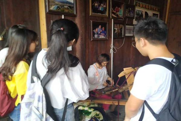 为深入展开调研,团队成员于7月13日前往惹巴拉镇非物质文化遗产遗产传习所,拜访了土家织锦技艺传承人,参观的当地的织锦物品展览,学习体会了织锦技艺。通过和传承人的交谈,了解了更多的土家文化和织锦的相关知识,对当地非物质文化遗产的传承有了更加深入的思考。
