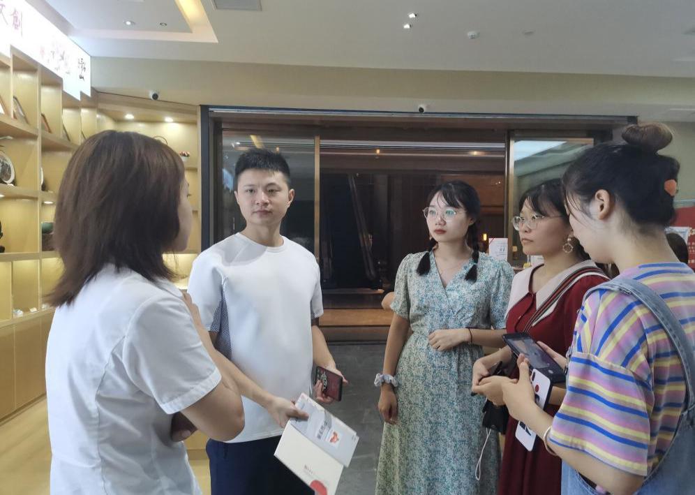 7月29日13点至14点30分,团队成员共同参观了韶山建国酒店的文创店。由韶旅集团的文创负责人为同学们详细介绍了韶旅文创的情况。通过咨询了解到,韶旅集团在旅游商品大赛中曾获多次奖项。其中,韶旅文创·进步青年学生套件荣获“2019中国特色旅游商品大赛”银奖。参观结束后,胡潜通过采访程子昊、文青、张慧、张子妮等人的现场参观感悟,让同学们对于红色文创的元素、载体、故事、受众等有了新的灵感与启发,对于后续与韶旅文创的合作同样也充满期待,以盼互利共赢、互相学习进步。