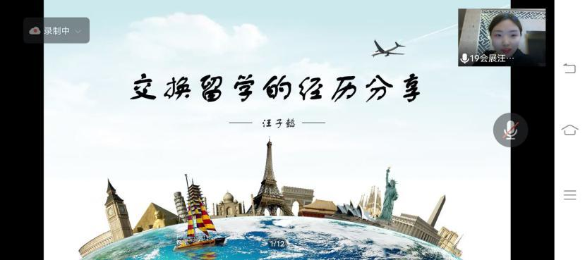 汪子懿从主要交换项目、近年交换情况、交换地选择及交换的优劣势等方面介绍了交换生的基本情况,同时分享了在交换过程中的收获。