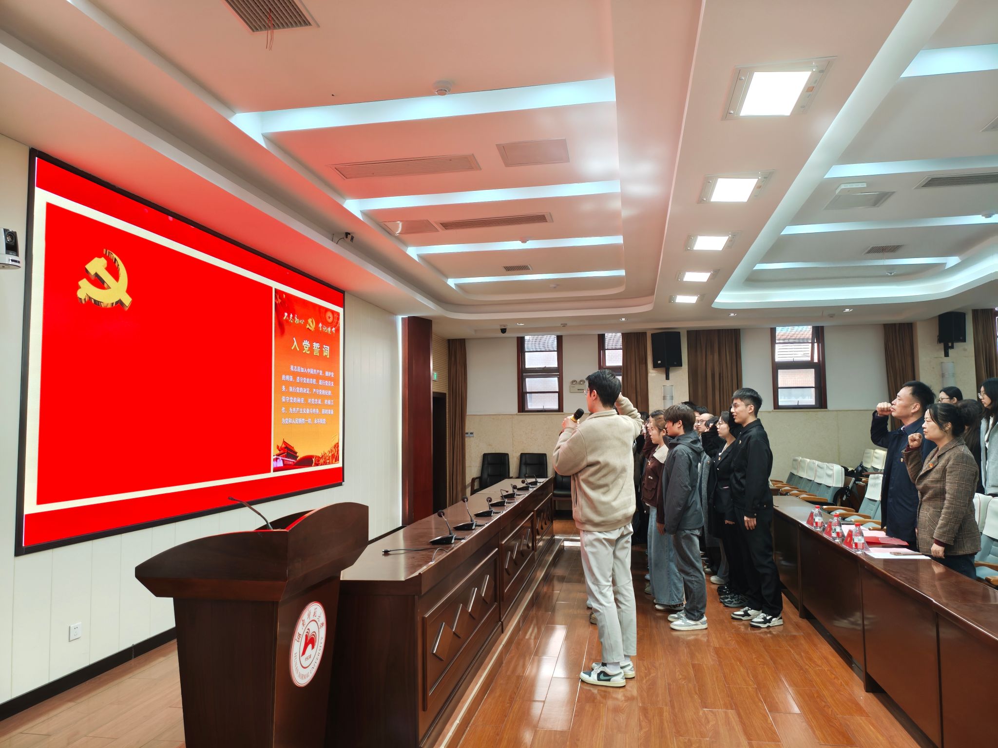 李天宇带领新发展的党员面向党旗进行了庄严宣誓,坚定的目光彰显出新党员们对党的忠诚和对初心的坚守。