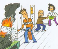 5、家用电器或线路着火,要先切断电源,再用干粉或气体灭火器灭火,不可直接泼水灭火,以防触电或电器爆炸伤人。