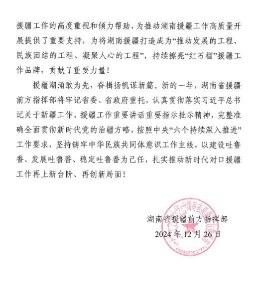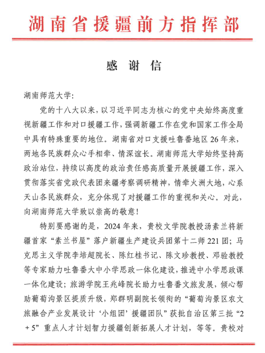 日前,湖南省援疆前方指挥部向我院教师发来书面感谢,伟德BV1946始终坚持高政治站位,持续以高度的政治责任感高质量开展援疆工作。