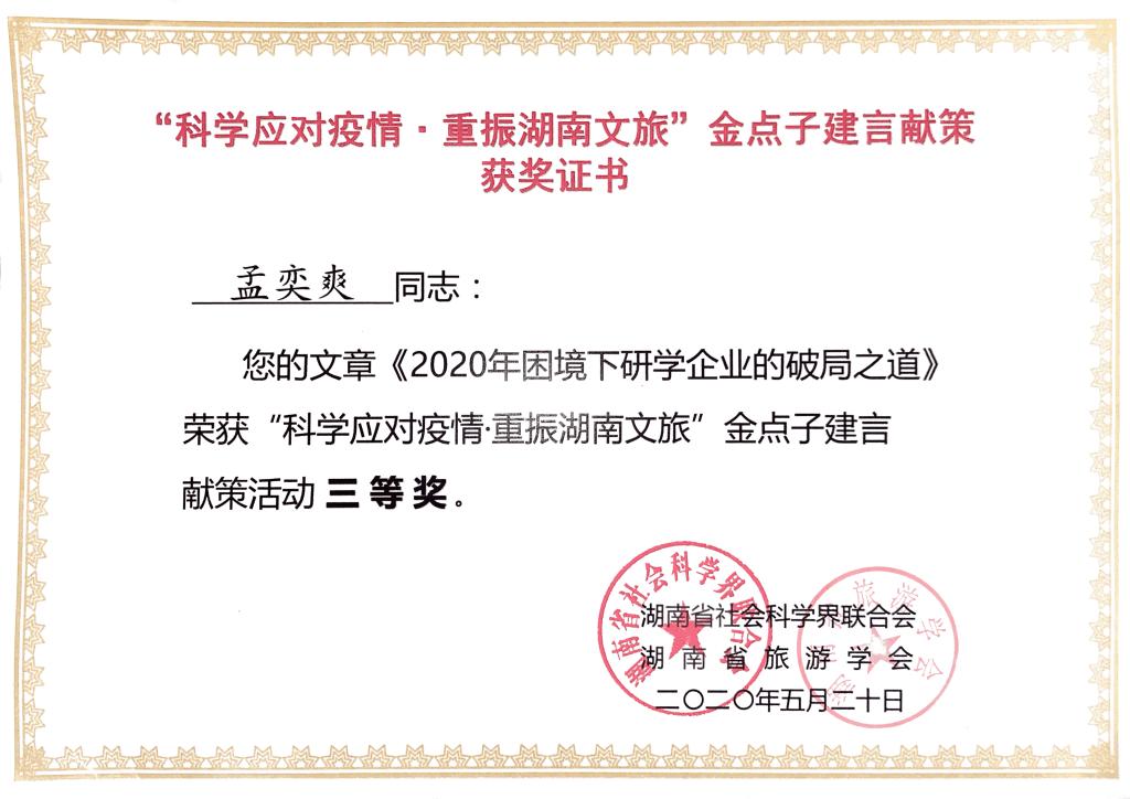 近日,在湖南省社会科学界联合会及湖南省文化和旅游厅指导下,由湖南省旅游学会组织文旅专家、企业家开展的“科学应对疫情·重振湖南文旅”金点子建言献策活动正式结束。我院6篇文章入选“科学应对疫情·重振湖南文旅”高质量发展文集。