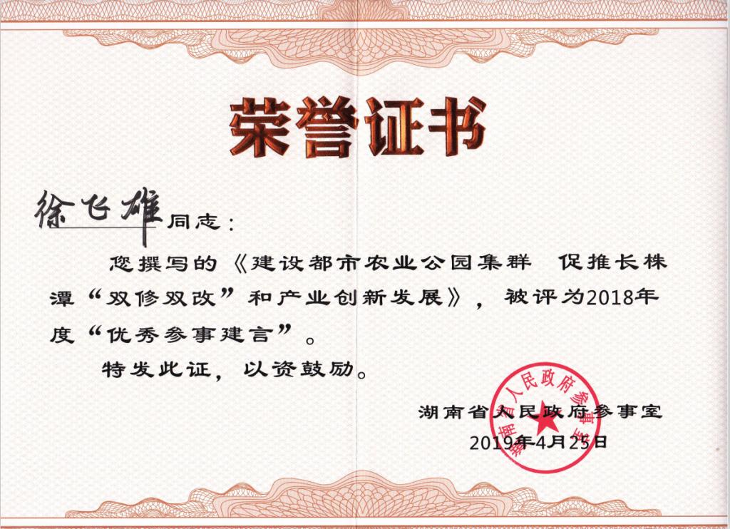 由徐飞雄教授撰写的《建设都市农业公园集群 促进长株潭“双修双改”和产业创新发展》被评为2018年度“优秀参事建言”。