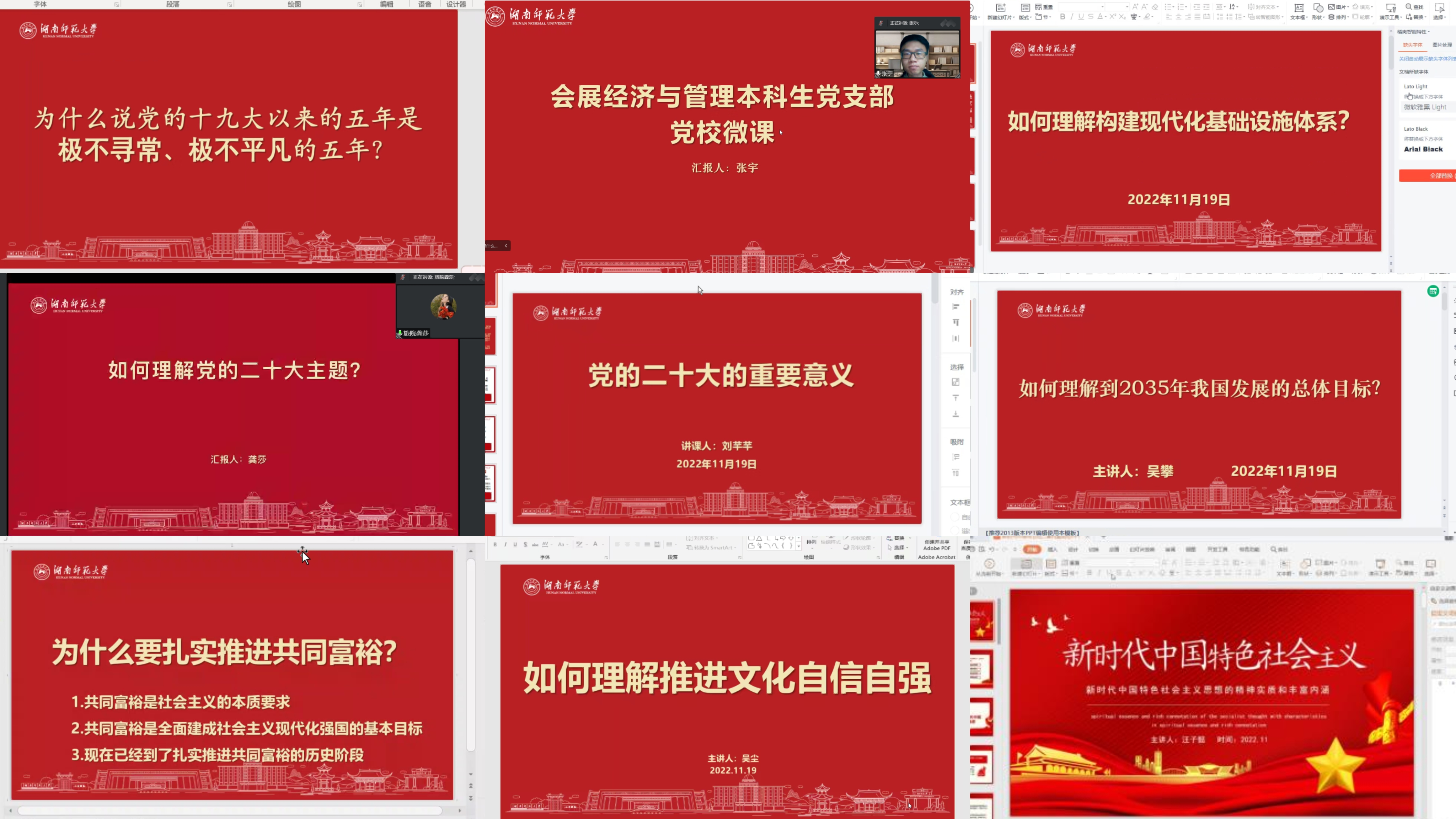 支部书记张敏以“为什么说党的十九大以来的五年是极不寻常、极不平凡的五年”为主题讲“微党课”。吴尘、王黎霞、汪子懿、鞠一凡、吴攀、刘芊芊、龚莎、安俊有、张宇等九位支部成员分别从不同角度对党的二十大精神进行了宣讲。