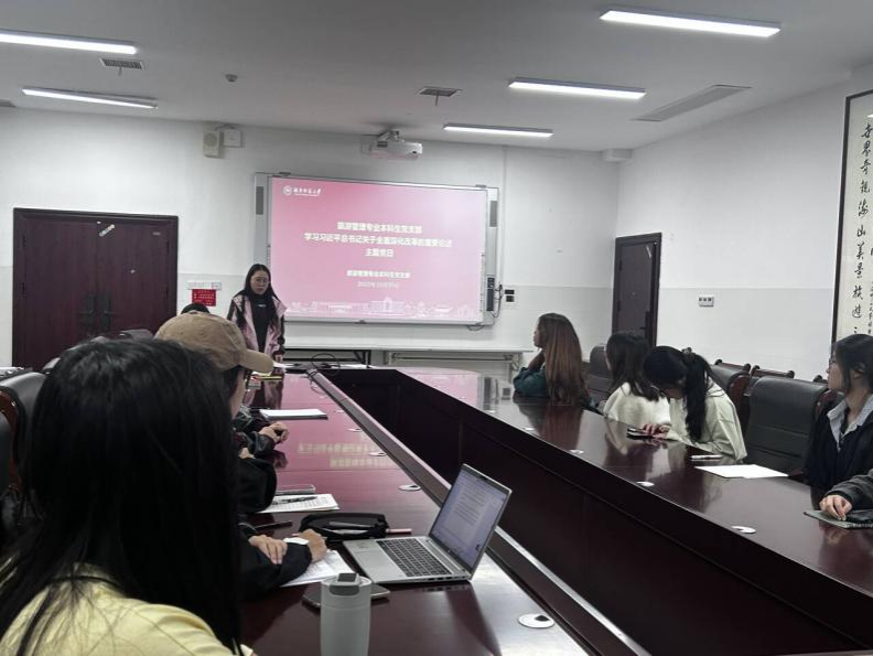 最后支部书记赵雅璇老师以“深学改革理论,践行创新担当”为主题,对党员提出要求。她强调,党员要深刻把握习近平总书记关于全面深化改革的论述,结合专业特色,把改革思维和科技创新引领产业发展的理念融入学习,为文旅高质量发展贡献青年力量。