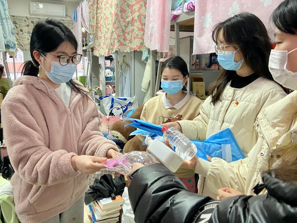 酒店管理专业本科生党支部党员在学生宿舍协助学院派发防疫物资,进行消毒杀菌防疫宣传。协助派发防疫物资包括1440个口罩、24支体温计、24瓶酒精喷雾和24瓶免洗抑菌凝胶。派发防疫物资的同时提醒各寝室同学多开窗通风,按时清理垃圾,定期喷洒酒精喷雾,确保不留死角、不留盲区,筑牢防疫安全防线。