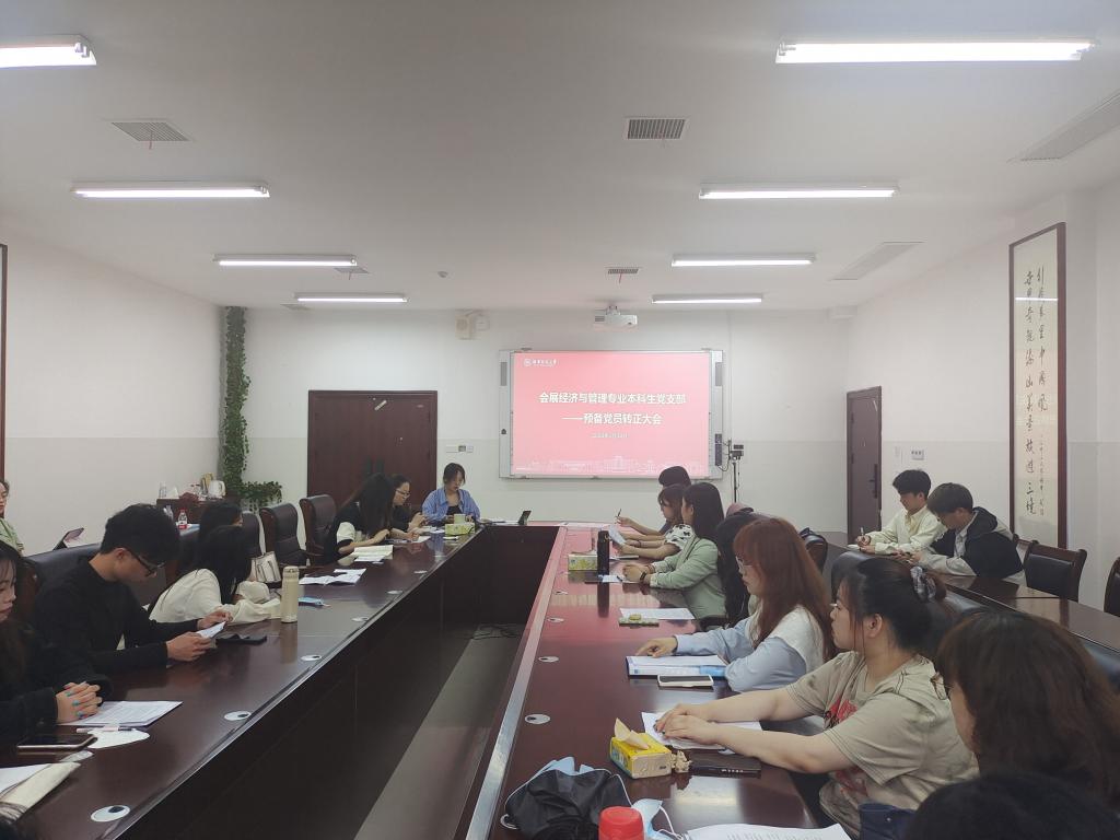 5月22日,会展经济与管理专业本科生党支部于中和楼233会议室举行预备党员转正大会,会议由支部书记夏梦婷主持召开。此次会议主题是讨论樊荣、向娟娟、张敏、李秧、吴尘、莫菲、肖玉洁、沈海涛、周爽、刘颖慧、马若曦、吴婧妤、李欣欣共13位同志的转正问题。支部第一书记谢胜文到会指导。