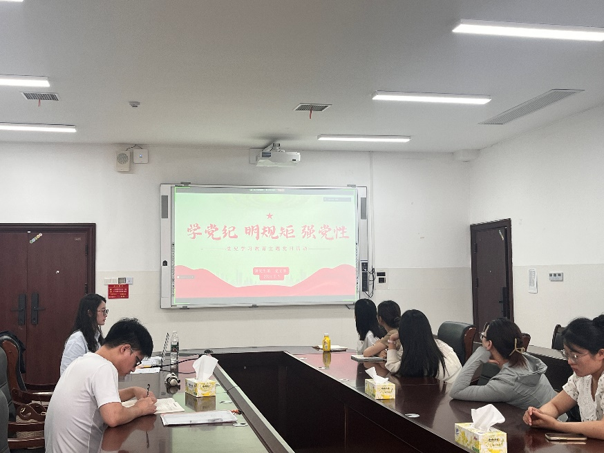 会议伊始,党员们观看了警示教育片。刘洁对习近平总书记关于全面加强党的纪律建设的重要论述进行解读,并勉励大家知责于心、担责于身、履责于行。支部党员袁喻彬、刘姗同志分别领学《中国共产党纪律处分条例》中的第十章、十一章内容并就党的工作纪律、生活纪律做主旨学习发言。参会同志就本次党纪学习展开充分研讨,结合自身学习经历,大家一致认为,纪律是党员行为的基本准则,必须时刻牢记并严格遵守。