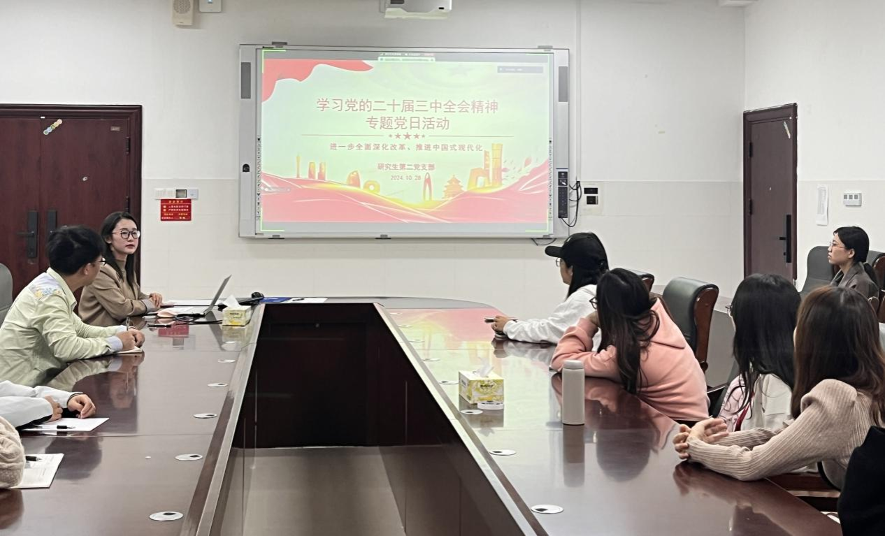 为深入学习贯彻党的二十届三中全会精神,进一步激发党员同志的责任感和使命感,10月28日晚上,研究生第二党支部于中和楼233会议室开展专题学习活动,活动由支部书记刘洁主持。