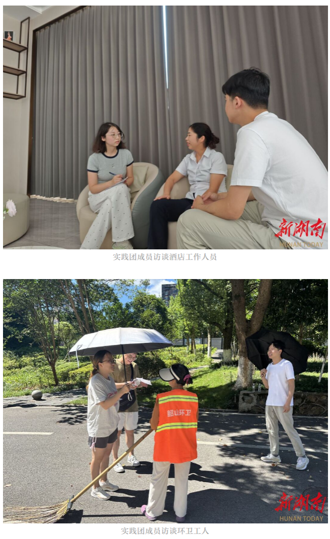 在韶山市区,实践团成员聚焦居民视角,关切行业与城市发展,走访街头,采访酒店从业者、餐饮从业者以及环卫工人等,从行业发展、市容市貌、民生改善等多个角度收集当地居民对旅发大会的态度与期待。