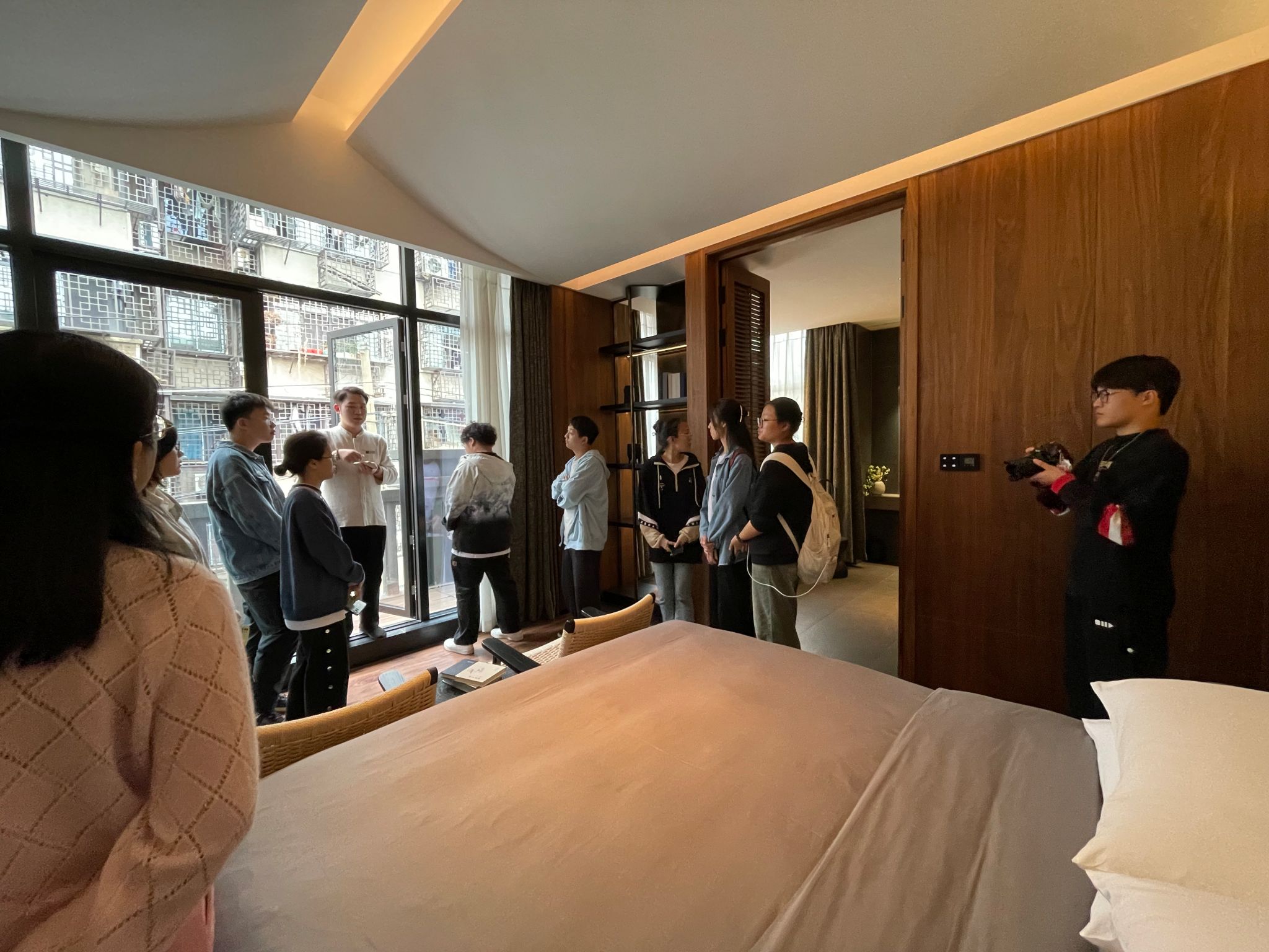 本次调研活动中,三十余名师生分为两组,在酒店经理的引导下分别对两家酒店进行参观,了解酒店的发展历史、设计理念与经营模式,感受酒店中的整体环境与服务态度。参观过后,老师和同学们同两位酒店经理分别进行了采访与座谈,聆听两位经理人的职场经历与对酒管生的职业规划建议。