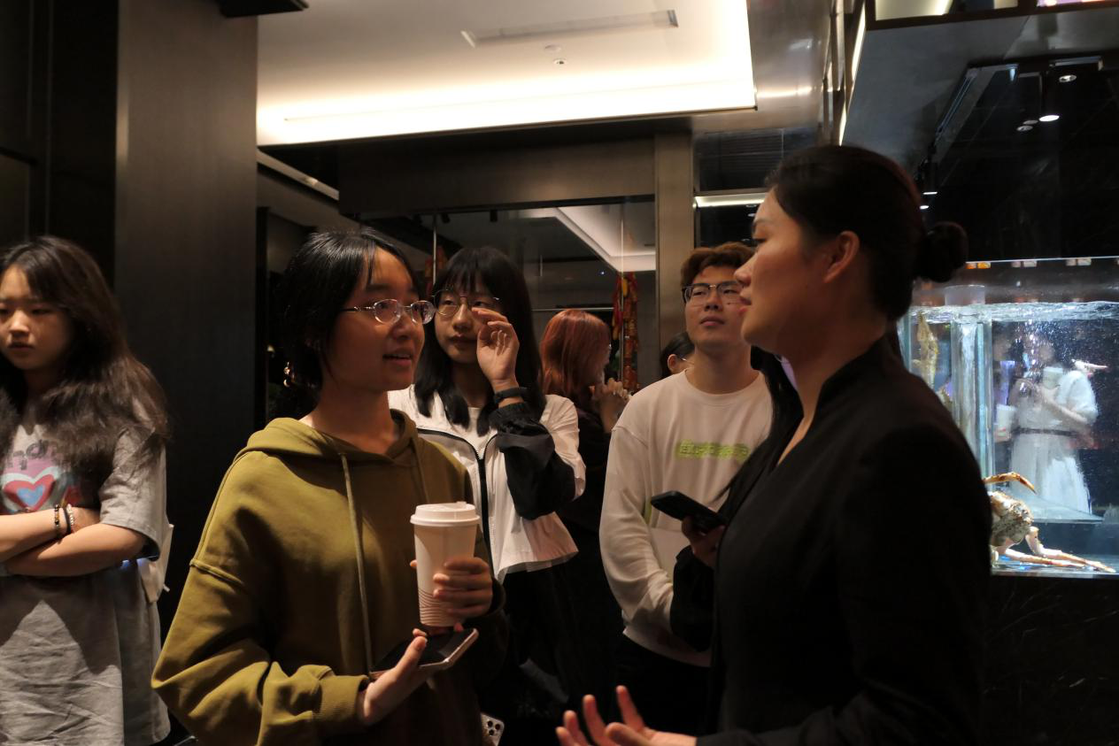 欢迎会结束后,餐厅总经理喻阳春带领同学们参观了餐厅,并向同学们讲述了餐厅的内部设计。喻春阳耐心地解答了同学们关于餐厅选品、菜品设计、顾客偏好、服务人员培训等方面的疑问。